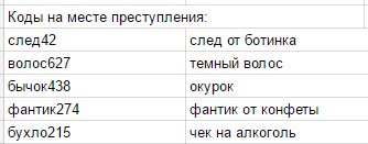 На месте преступления (в котельной) нужно было найти улики, их всего 5. Эти улики задают 5 параметров, по которым нужно вычислить преступника. На местах обыска (в коттедже) найденные в каждой комнате коды открывали в движке информацию о владельце этой комнаты. Из подозреваемых по всем 5 параметрам подходит только один. К сожалению, отписывала уровень не сама, поэтому не знаю, что именно на месте пошло не так. Буду рада получить фидбек, можно здесь, можно лично. Как выглядел уровень в табличке: З.Ы. С именами, конечно, косяк, не сложно было делать непереборные имена. Я всегда перестраховываюсь античитами даже там, где это не нужно, а тут прямо помутнение какое-то, сама не понимаю как пропустили этот момент. Простите.