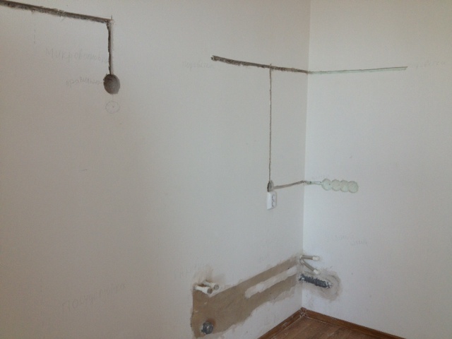 Трубы нам сделали вроде хорошо, чуть-чуть совсем торчит, некритично (кому надо, могу порекомендовать хорошего сантехника). Штробу вчера узбеки сделали (там по прямым все), с дырками под розетки. Мебели нет, отделка от застройщика.