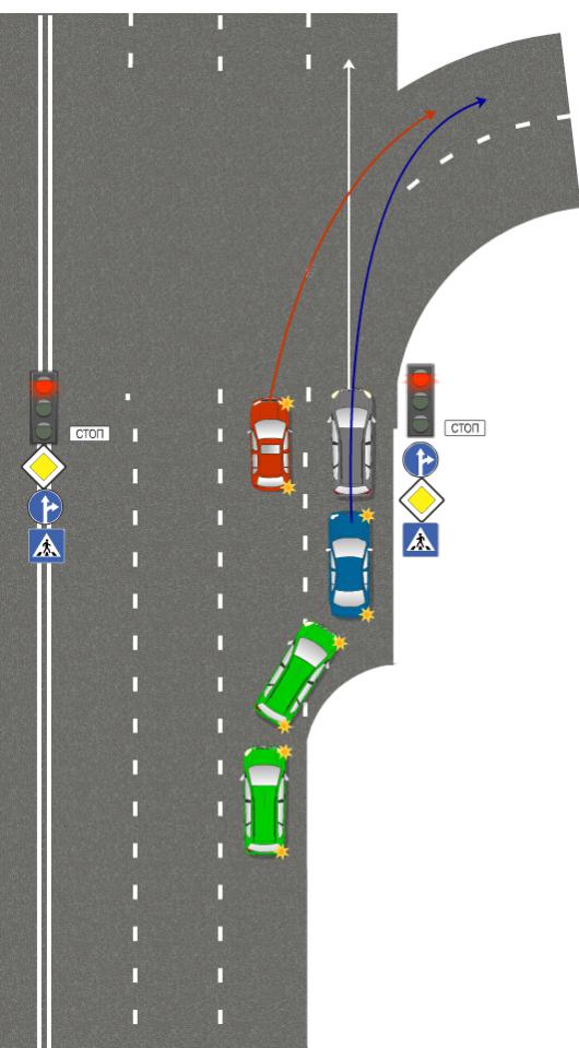 После включения зелёного сигнала серый авто поехал прямо по белой стрелочке (имел право, кстати), синия я за ним по синей стрелочке, а красный попытался поехать по красной стрелочке, но я ему не дал это сделать, из-за чего он пытался на меня ругатьться. P.S. был разбор недавно, результаты выкладывали на клубном форуме, суть его сводится к следующему: Синий автомобиль из среднего ряда, имеющего знак "по полосам прямо и направо" поехал направо. Красный автомобиль из правого ряда под знак "по полосам только направо" поехал прямо. Они встретились. Красный пытался качать права, что синий "не убедился в безопасности маневра", но и разбор и суд были неумолимы: "Синий поехал направо из ряда, из которого имел право ехать направо. Красный поехал прямо из ряда, из которого он не имел права ехать прямо. Значит красный виноват полностью и нечего больше обсуждать." |