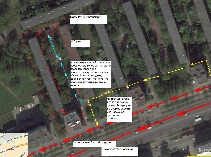 Мне тоже было бы удобно заехать во двор не только с Народной. Но, к сожалению, из-за долбо*бов и пид*расов приходится этим жертвовать ради своего же спокойствия.