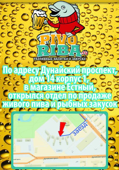 Расположен он по адресу Дунайский проспект, 14, к. 1 в ЖК «Viva» (схема проезда указана на картинке внизу) По всем известному паролю «Дедлайн», скидки 15% на всю жизнь, причем как на пиво, так и на снеки (все цены ниже без учета скидок). На сей момент 6 сортов: Светлое фильтрованное: Жигулевское (Хвойнинский, Великий Новгород) – 150 руб Чешское барное (Бочкари, Алтай) – 140 руб Светлое нефильтрованное: Weiss Berg (Бочкари, Алтай) – 160 руб Культ Пшеничное (Крыница, Минск) – 160 руб Темное фильтр: Ирландский Эль (Бочкари, Алтай) – 180 руб Медовуха: Хмельной мёд дикий (Медоварус, СПб) – 180 руб На подходе (до НГ) еще несколько: Blonder Beer Красное н/ф (Крафтовая пивоварня Blonder Beer, СПб) – 190 руб Вишневое Dome Kriek (Пивоварня Dome, СПб) – 200 руб Квас Медоварус (СПб) – 110 руб На закусь всегда есть выбор рыбных снеков и орехов (янтарная, минтай, треска, арахис, фисташки). На каникулах, если будут желающие в количестве более 1 человека – можем устроить дегустацию (сделать скидки 25% на объем в 0,5 л.) – чтобы вы могли приехать попробовать и выбрать, ознакомившись с ассортиментом.Качество пива уже успели оценить Laww, Mark, Punch, Aspirin, которые присутствовали на «пробном запуске» На сей момент, ЖК «Вива», в котором размещается магазинчик, заселен менее, чем наполовину. Поэтому просим с пониманием отнестись к небольшой линейке, но мы готовы прислушиваться к пожеланиям и, в случае роста спроса и интереса, расширять и изменять линейку напитков, в соответствии с Вашими пожеланиями. Будем рады любой конструктивной критике, Вашим отзывам и пожеланиям. Схема проезда: